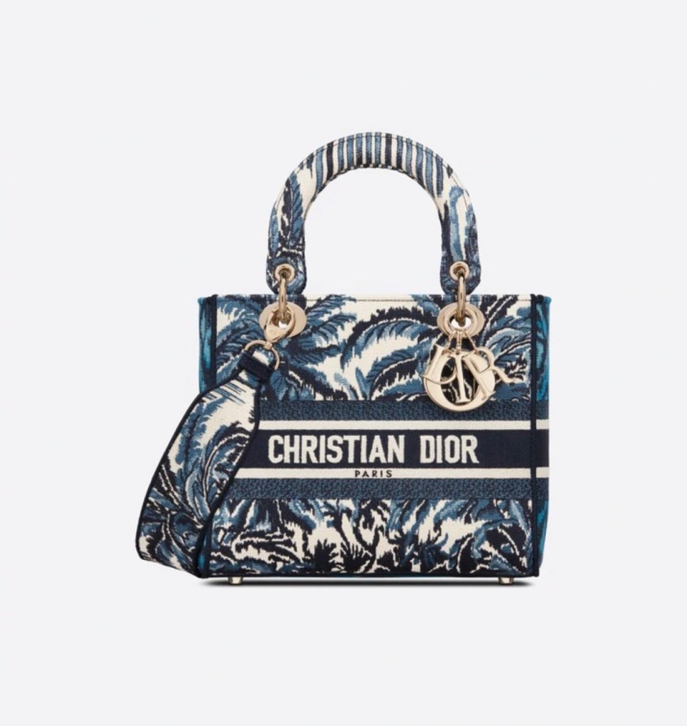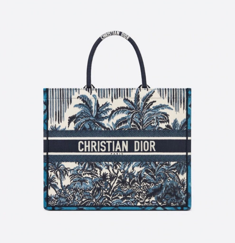 ได้รับการออกแบบมาเพื่อพกพาสิ่งของจำเป็นในชีวิตประจำวันภาพเงานำเสนอรูปแบบใหม่ของสัญลักษณ์ Toile de Jouy ด้วยรูปแบบการปักที่หลากหลายพร้อมลวดลาย Dior Palms สีน้ำเงิน